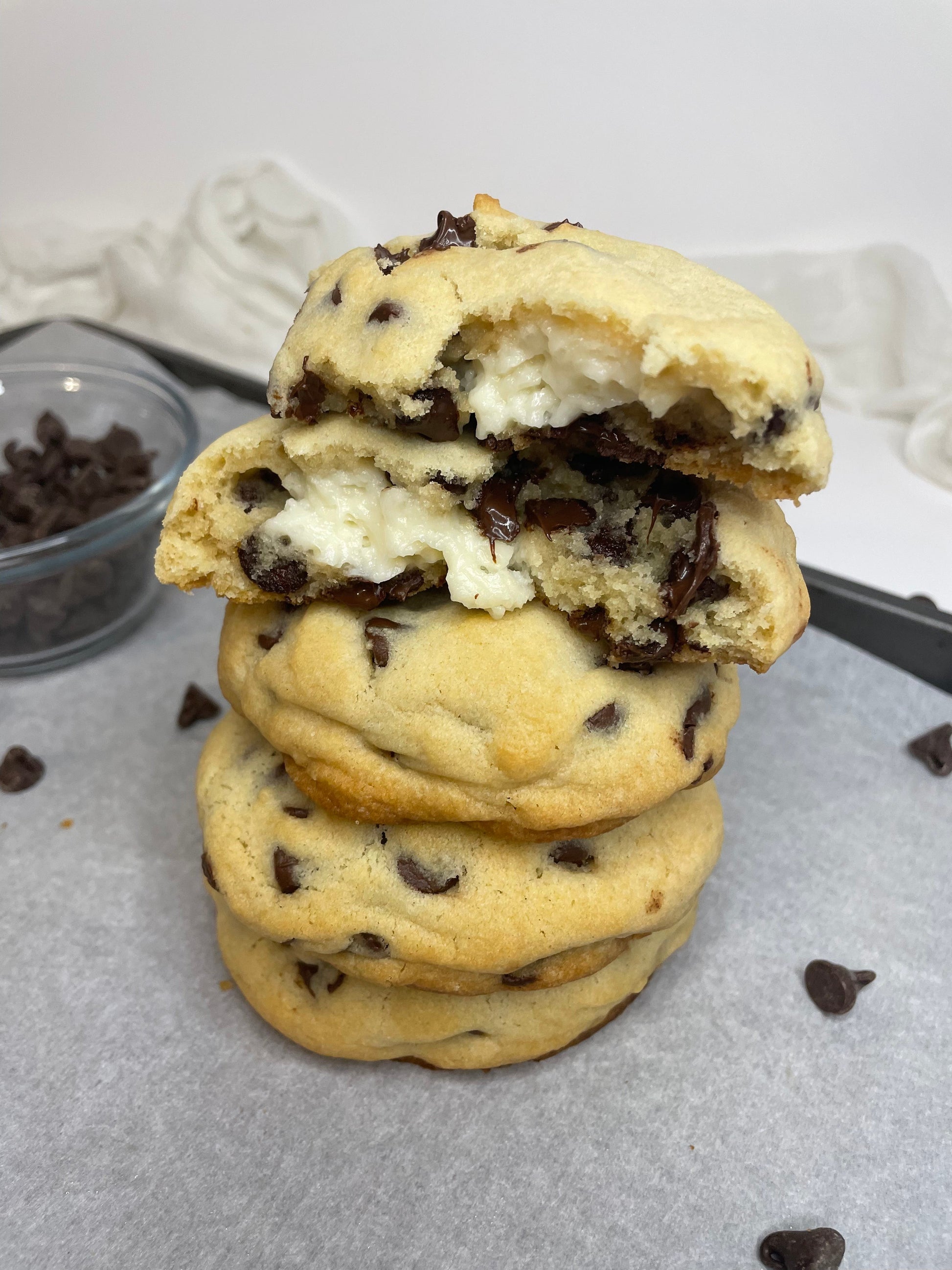Chocolate chip cookies stuffed with a sweet cheesecake filling Indulgent bites of joy, with layers of flavor in every delicious cookie. Enjoy the perfect balance of chocolate chip cookie and sweet cheesecake filling for an unforgettable snack.